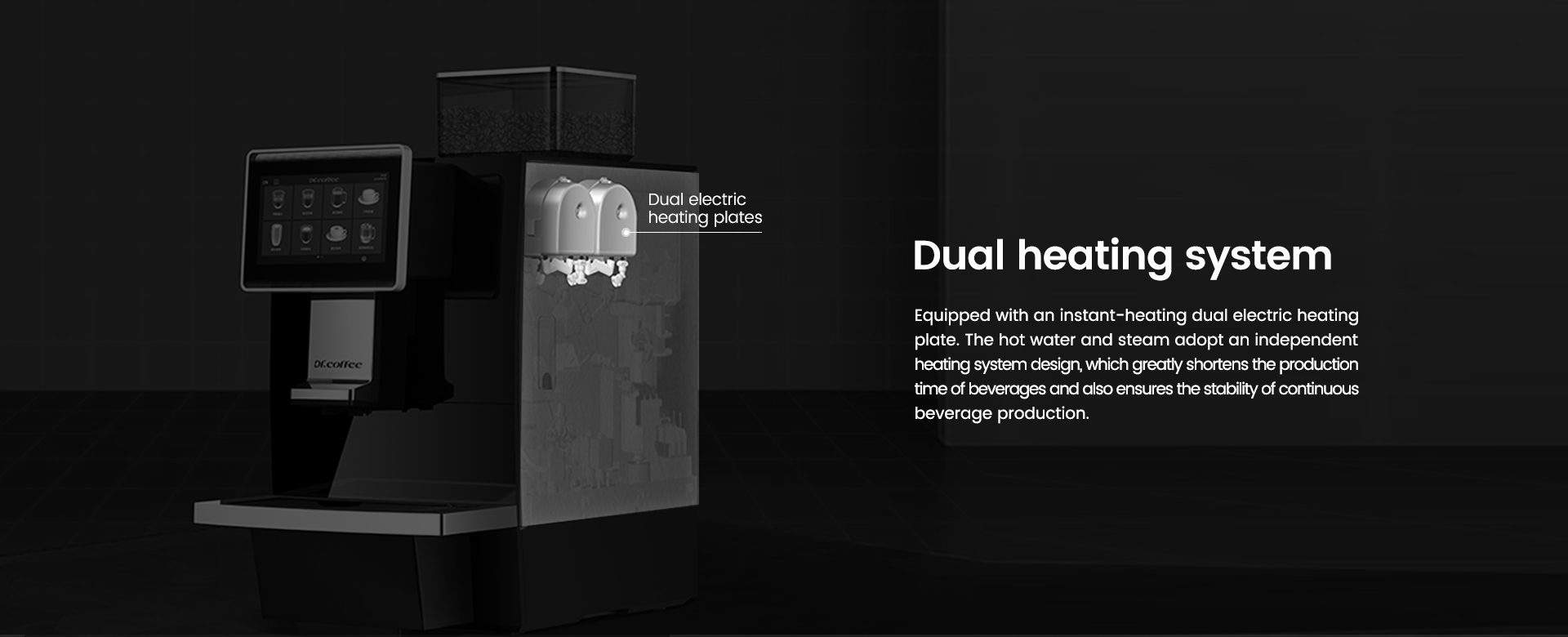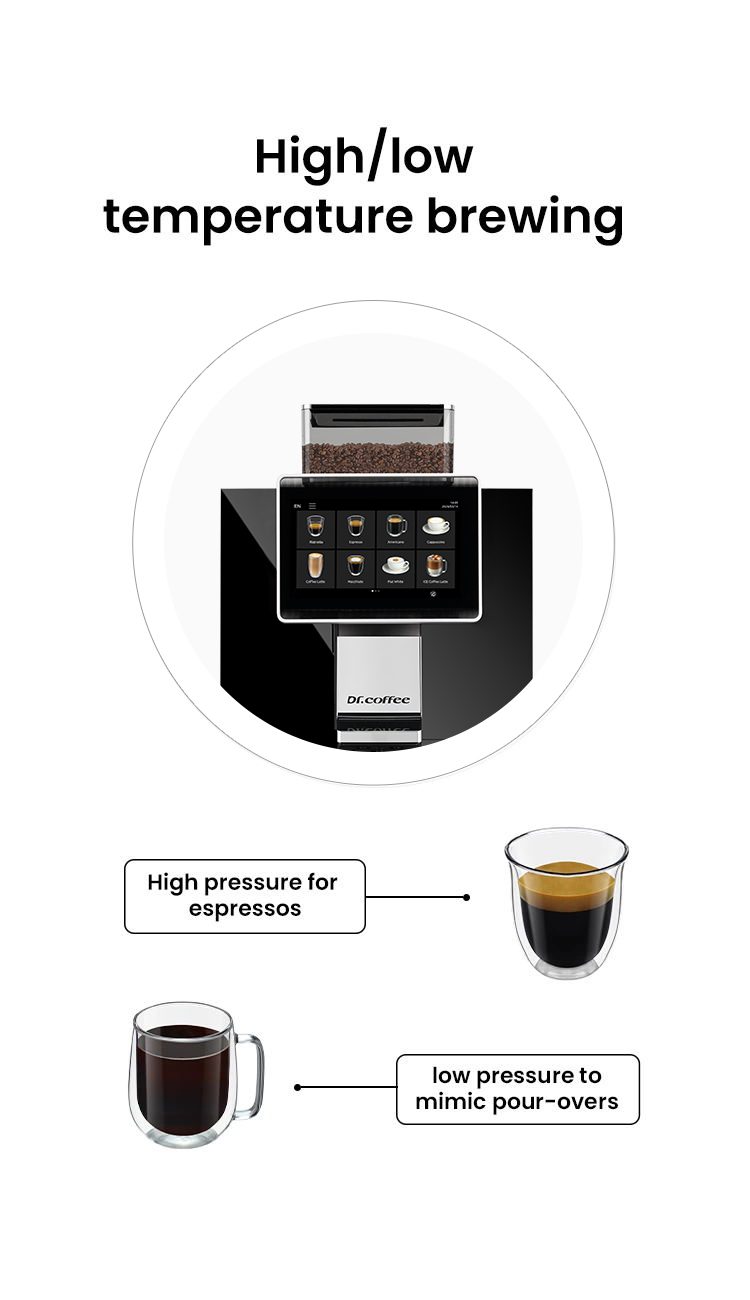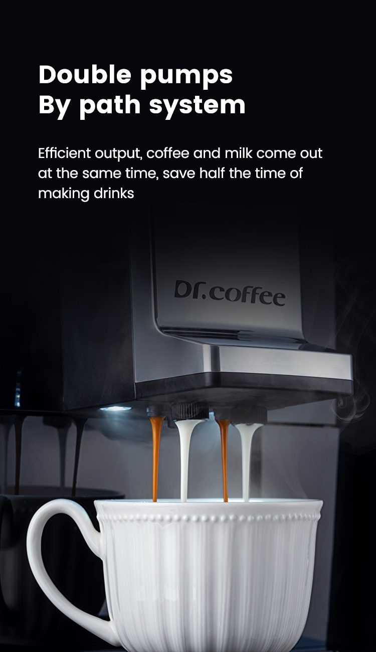 As the Flagship Model of Dr. Coffee’s Super business machine Series . M10 not only has the noble and elegant exquisite apperance but also has the super high production efficiency. Detachable design of the whole milke tube, no intereference with the milk self- cleaning, maintainence and cleaning more easy. Hidden milk tube design, beautiful and more hygienic. Expertly crafted black and milk coffee, a familiar and reliable choice for your business success.